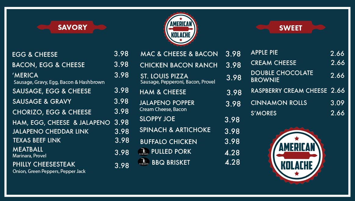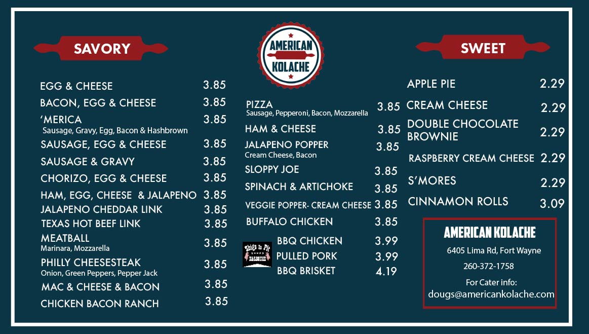 American Kolache Menu Order Online | Peoria ORDER CATERING Got questions about the menu? Call or email us at the contact information below with questions! Peoria 309-839-2634